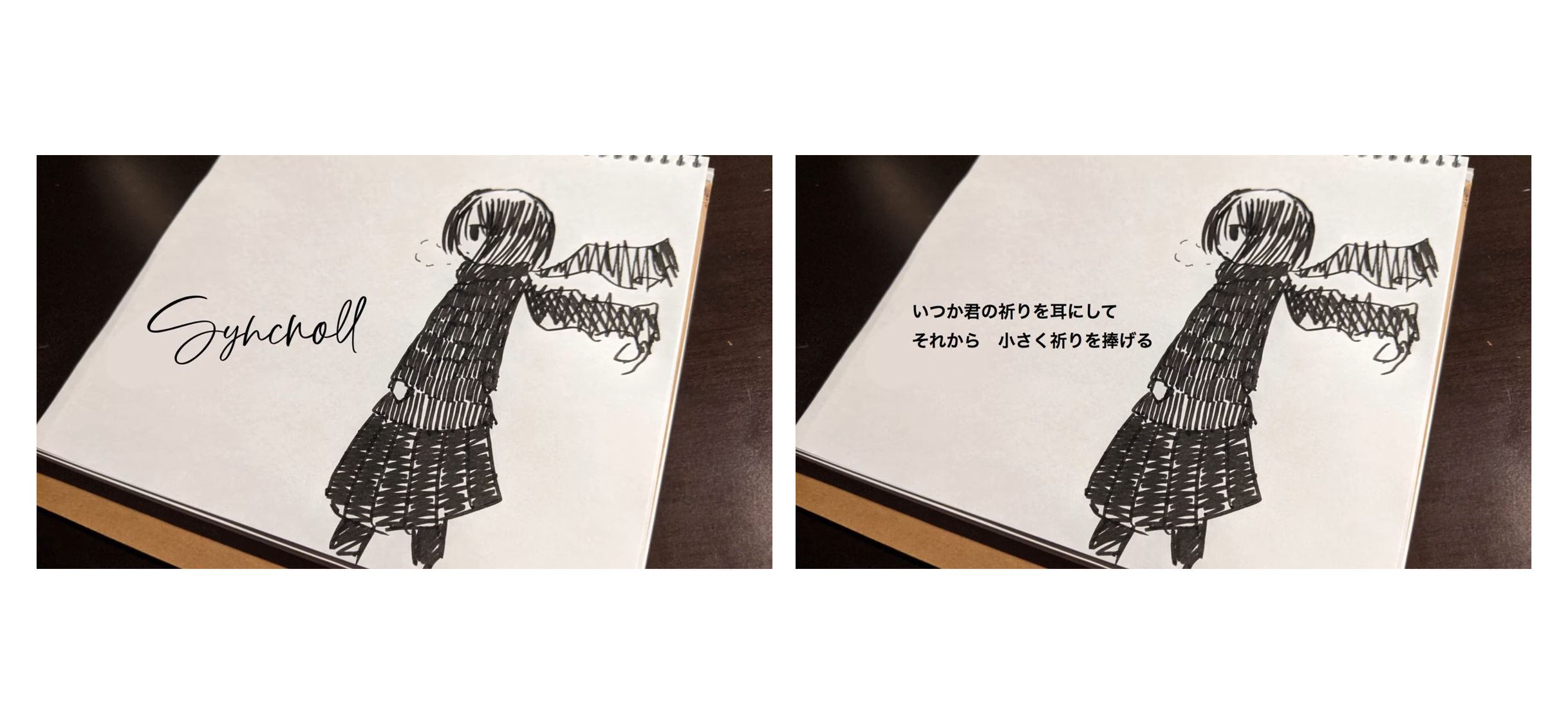 【映像】シンクロール 概略 アナログの絵に書いた絵を写真に取り、それをそのまま映像にした。第三者視点、こちらを気にしていない少女のイラストレーションで、片思いの感じが出ていたら良いなと思う。 作品 使用ツール サインペン Davinchi Resolve クレジット Sotono楽曲、動画、絵、写真